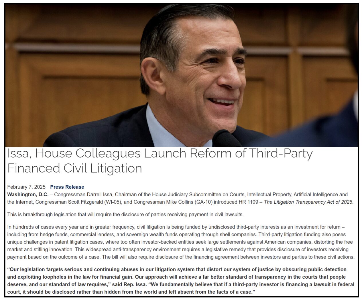 Our friend Rep. Darrell Isa has sponsored the Litigation Transparency Act of 2025, which would require disclosure of these agreements in federal civil cases.
