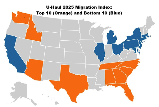 U-Haul keeps track of how many of its one-way moving trucks move from state to state. In 2025, Texas edged out Florida as the top destination state – though our VoteWithYourFeet website points out that wealthier movers are relocating in Florida.