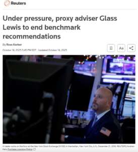 In other words, Glass Lewis will no longer be telling all of its customers how to vote on shareholder resolutions. Given Glass Lewis’ support for liberal causes, this is a HUGE victory.
