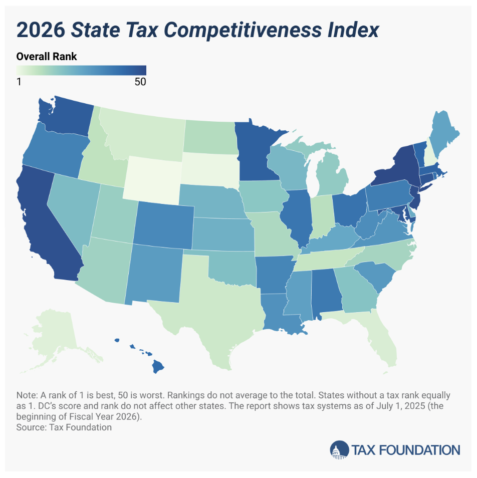 Here’s the latest ranking from the Tax Foundation on economic competitiveness of their taxing system. We can’t help noting that taxes are headed up in 2026 in the three already-heaviest taxed states.