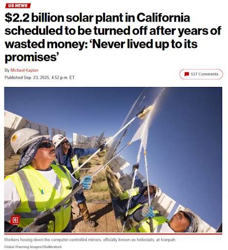 But that money is down the green energy drain with the news that the Ivanpah Solar Project is closing next year. It not only never produced its promised energy, but needed to rely on natural gas to keep operating. That sounds a lot like America writ large.