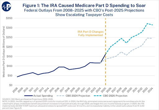 The left is VERY good at planting fiscal time bombs in the budget whose costs explode in the “out years.” Exhibit A is the inaptly titled Inflation Reduction Act. Casey Mulligan, at the time a senior fellow with Unleash Prosperity, repeatedly warned that the IRA would drive premiums and subsidies in the Medicare Part D prescription drug program higher, despite the Biden administration insisting it would generate hundreds of billions in savings. Guess who was right? This chart from the Paragon Health Institute shows how the Part D spending projections from CBO have moved since the bill passed.