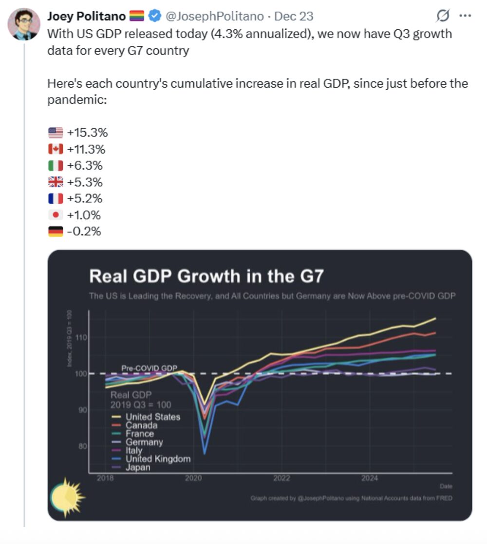 We made grievous policy errors during the first two years of COVID, when the economy and schools were shut down. But thankfully, red states with great governors like Ron DeSantis kept their economies mostly open for business, and Trump opened up most activities far faster than most other nations.
