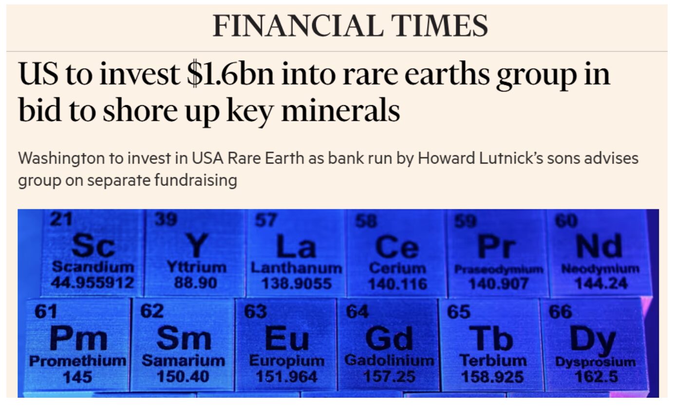 The Financial Times reports that the Commerce Department “is planning to inject $1.6bn” and “will receive a 10 per cent stake in USA Rare Earth, a publicly traded Oklahoma-based miner that controls significant US deposits of heavy rare earths, according to people familiar with the matter.”