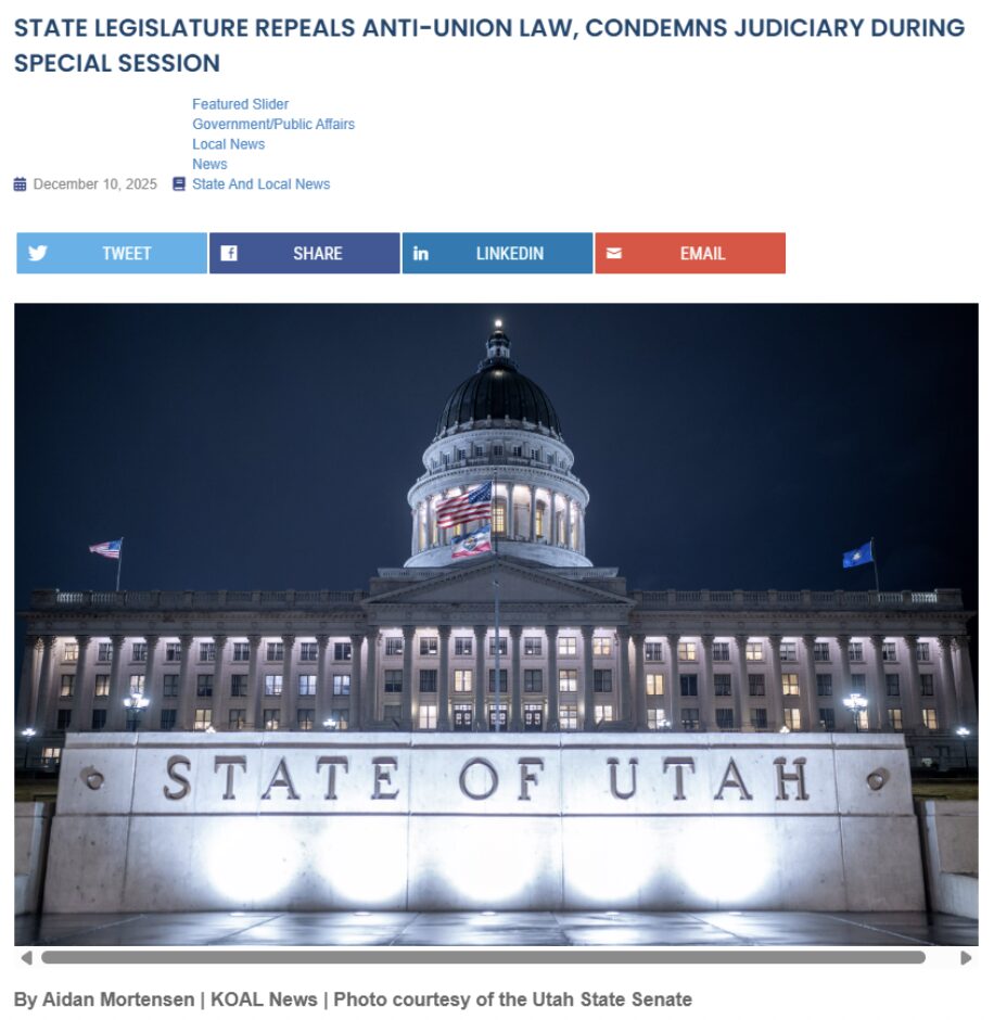 Furious union leaders promised to place a veto referendum on the ballot to undo the law. The head of the state’s firefighters union proclaimed the new law would make Utah “the most anti-labor state in America.”