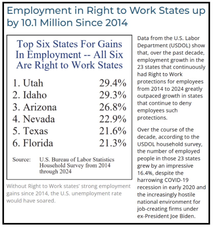 As regular HOTLINE readers know, right-to-work laws are highly associated with prosperity across states. The states (mostly in the south and mountain states) with Right to Work have for several decades had double the job creation rates as the forced union states.