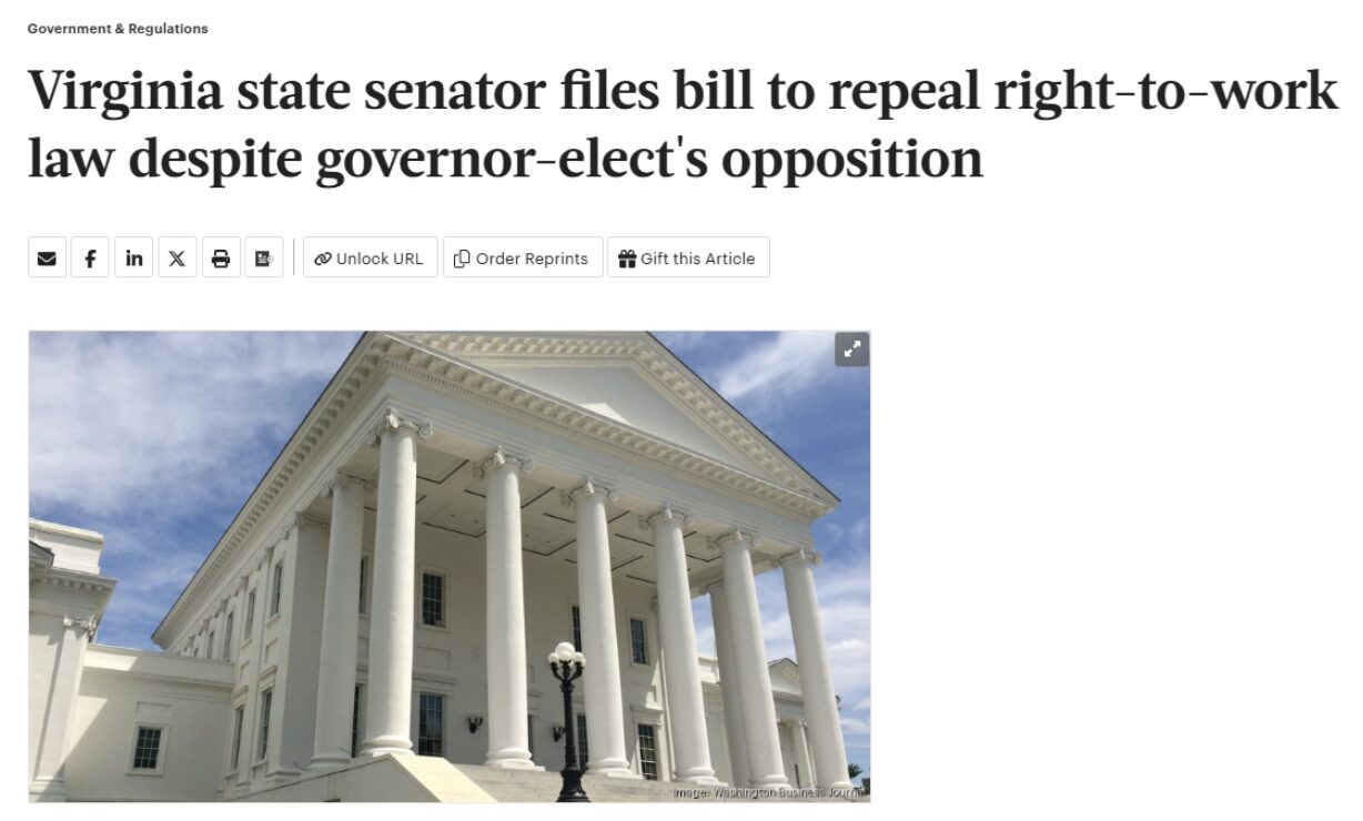 In recent years, we’ve worked with our friend Mark Mix, president of the National Right to Work, to keep these laws in place. It is imperative that Virginia NOT become the sore thumb of the south and turn state control over to the big labor bosses.