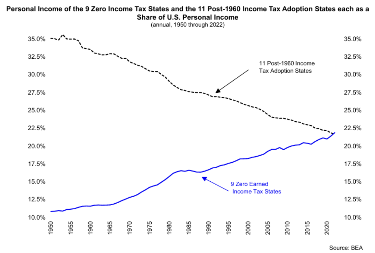Pennsylvania’s share of national output declined 42% since its income tax of 1971; West Virginia has lagged national population growth by 56% since its income tax of 1961; and Rhode Island’s share of state and local tax revenue nationally has plummeted by a third since its income tax of 1971. In terms of the change in its share of the nation’s population, economic output and population, not one of the new income-tax states registers a positive number since the imposition of this tax. And the negative numbers are often highly negative.