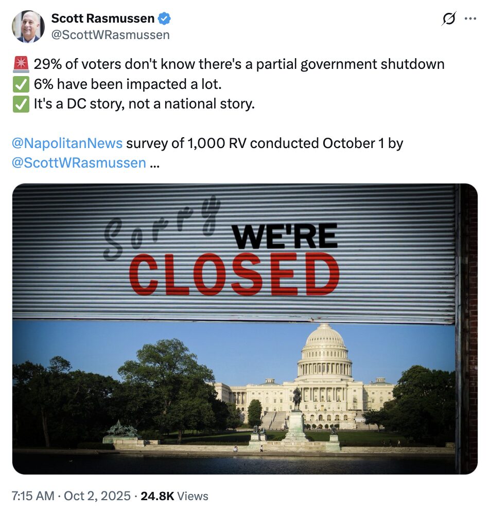 Only 6% of voters say they are greatly impacted by this shutdown (and they probably live in the swamp). More evidence we can live permanently without most “non-essential” federal employees.