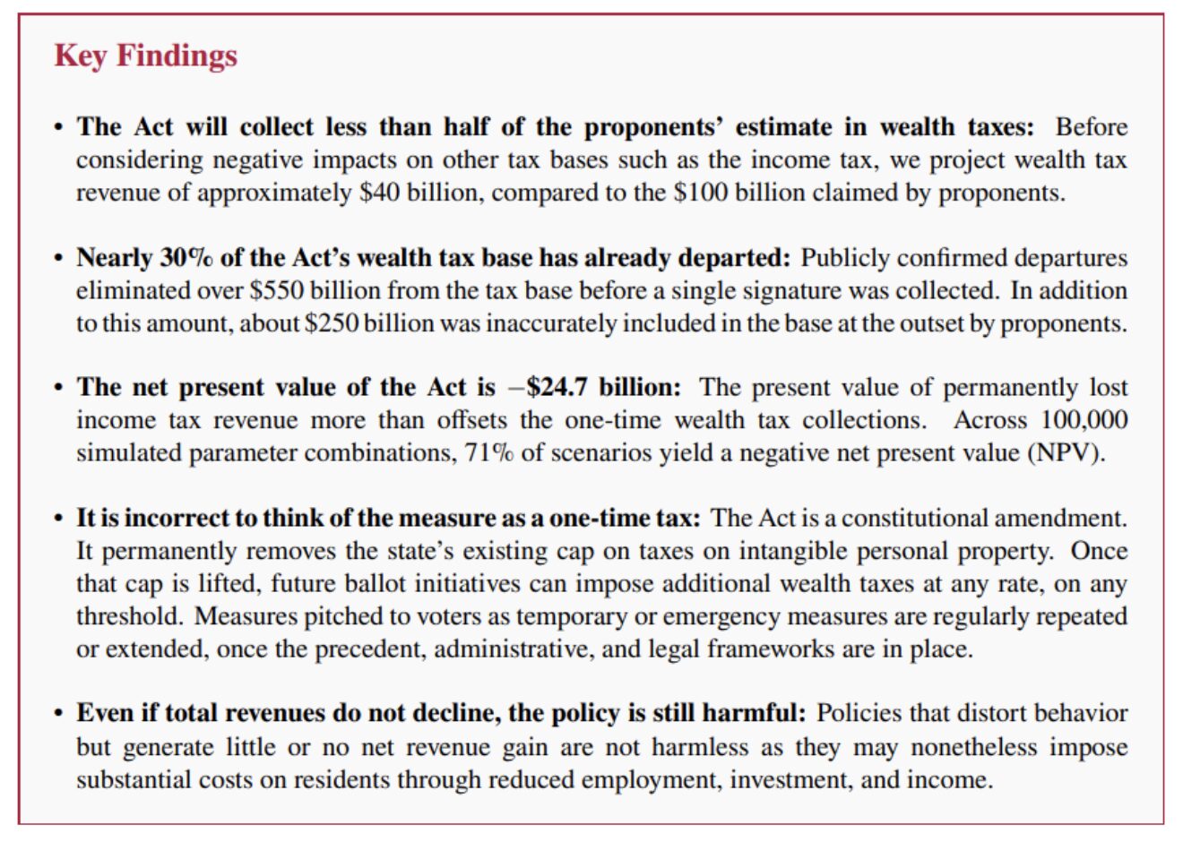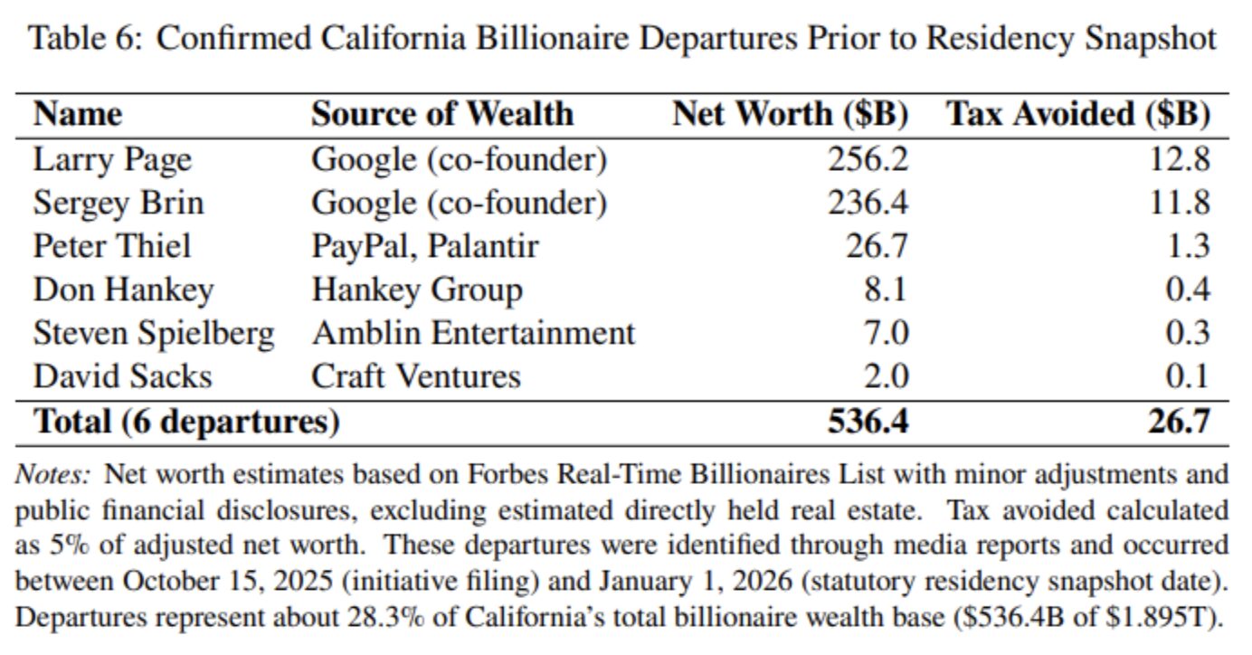 A new study by economists at the Hoover Institute finds that at least six billionaires left the Golden State before the start of the year to avoid the proposed California Billionaire Tax Act. This is a ballot initiative to be voted on later this year that would create a 5% wealth tax on billionaires who have lived in California at any time after January 1, 2026. Proponents expect a $100 billion windfall to the California treasury.
