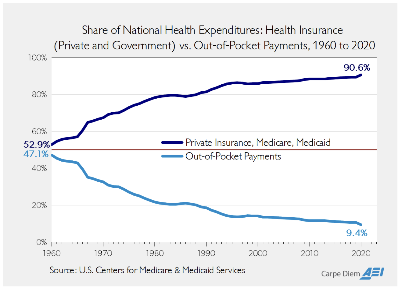 That wasn’t always the case. Perry shows that in 1960, half of medical costs were paid by the patient and today it is less than 10% with many Obamacare subsidies offered for free – I.e., no co-pays required!