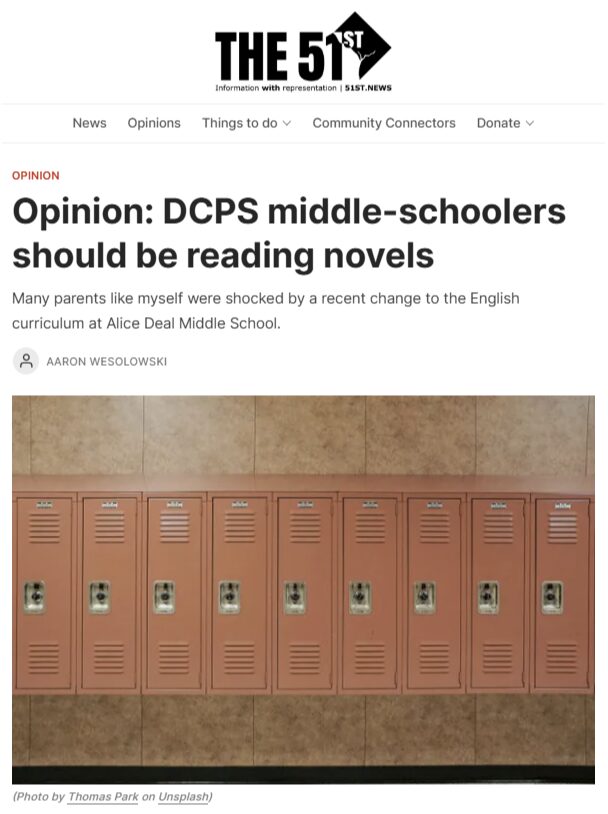 But now, we learn Alice Deal Middle school has decided to remove all full-length novels from their eighth grade English curriculum.