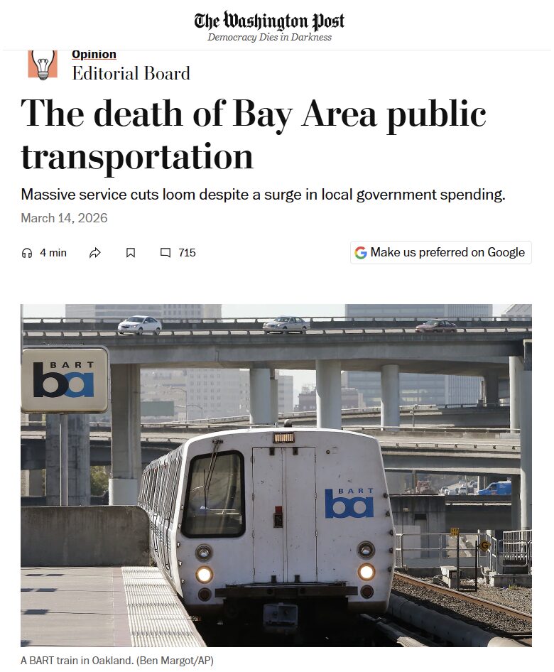 The Washington Post has taken a deep dive into the finances of BART — San Francisco’s Bay Area Rapid Transit and discovered why it’s in a financial hellhole.