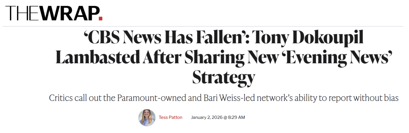 Tony Dokoupil, Weiss’s pick to be the new anchor of CBS Evening News, has a record of independence as a reporter and broadcaster. His two-minute introductory video released last week included the blunt admission: “No one trusts mainstream media anymore.” (We’re raising our hands!)