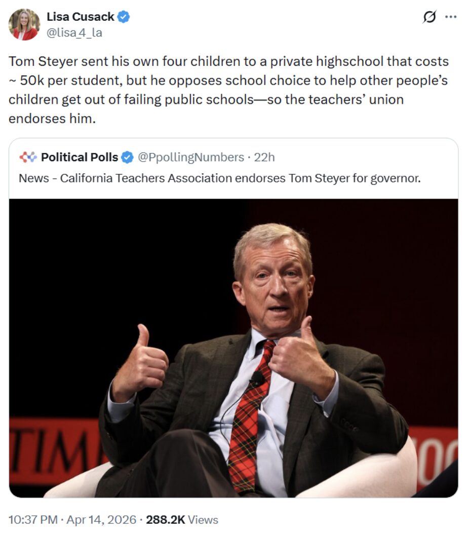 Steyer has just been endorsed by the powerful California Association of Teachers, who switched from Swalwell, in recognition of his slavish support for their agenda and opposition to school choice.