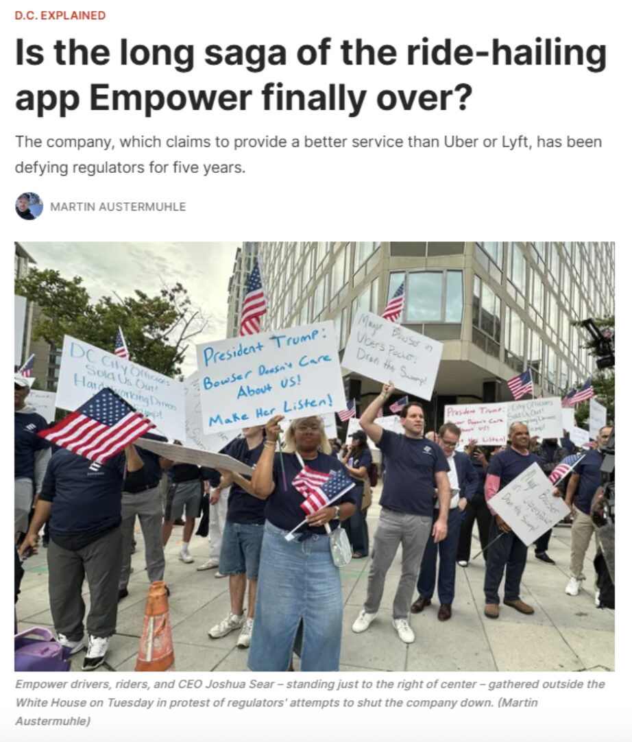 So in 2020, when a new ride-hailing service called Empower entered the D.C. market, it faced an even more hostile reception. Drivers loved that it “empowered” drivers to work for themselves, set their own fares, and collect 100% percent of the proceeds–only paying Empower a flat monthly rate to use its software. Users benefit from fares that are on average 20% less than Uber or Lyft. It gets rave reviews.