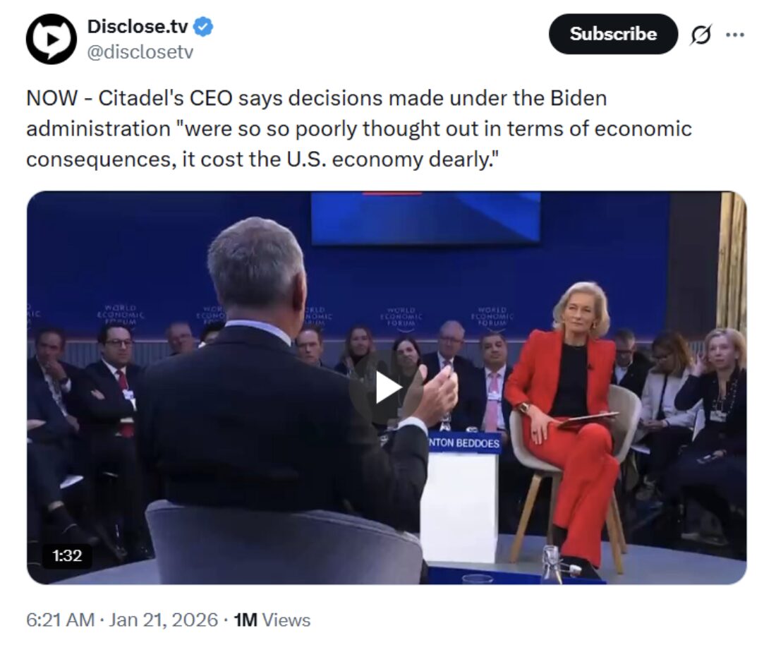 Our quote of the day comes from Ken Griffin, head of the multi-billion dollar hedge fund Citadel, who reminded the world on Wednesday at the World Economic Forum in Davos just how much Joe Biden wrecked the economy:
