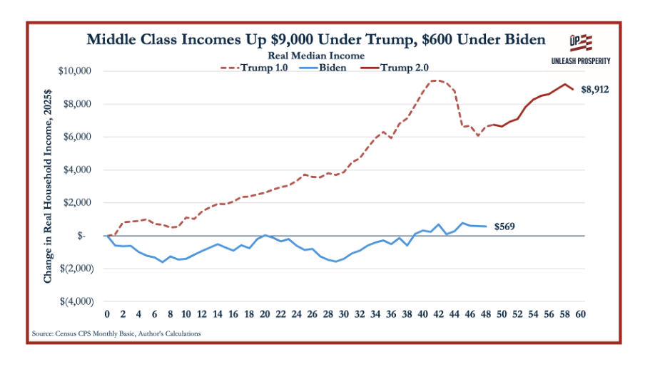 Meanwhile, Trump policies, such as the Big Beautiful tax bill are increasing take home pay, while deregulation has saved the economy more than $1 trillion in deadweight costs.