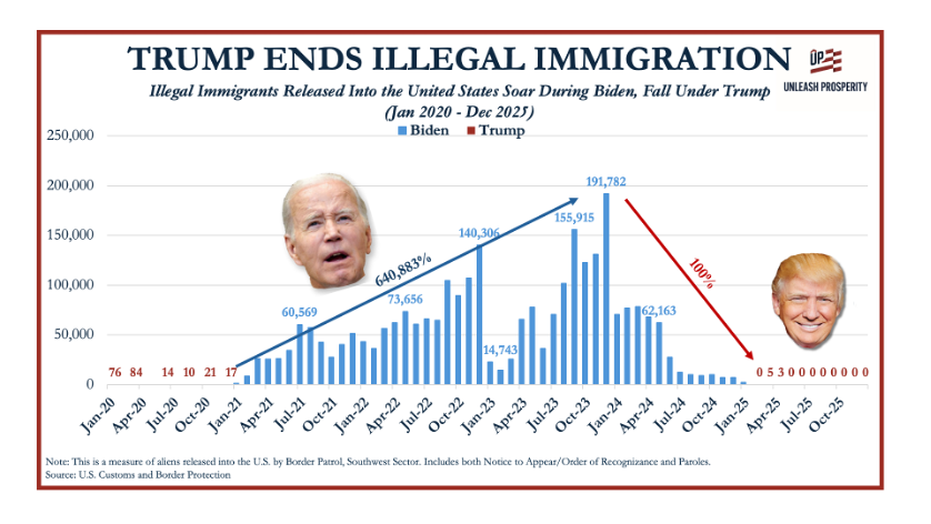 Illegal immigration skyrocketed to 6 to 10 million people under Joe Biden – many of them intentionally released by border patrol with little more than a request to appear in court. Under Trump, illegal immigrants processed and released into the country by US Border Patrol have been reduced by more than 99.9% – the largest reduction in illegal aliens in history. This has been achieved in just 12 months with no changes to the law required.