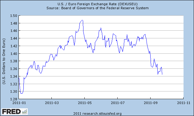 Now, QE2 has ended, and there is talk of monetary easing from the ECB. These factors, perhaps combined with Europe’s mounting debt crisis, have pushed the dollar up versus the euro, with the euro falling from $1.45 in late August to $1.31 yesterday, a decline of about 10% in one month: